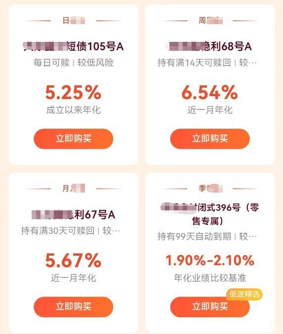上述各产品突出的收益信息各有侧重,日开型产品显示成立以来年化收益率(5.25%);14天、30天持有型产品显示近一个月年化收益分别为6.54%、5.67%,其余更长期限持有型产品展示了各自年化业绩比较基准。