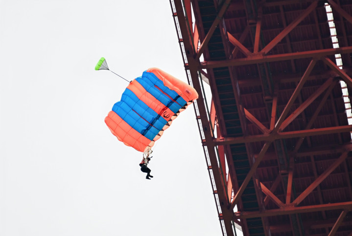 低空跳伞是一项高度专业化的极限运动,要求运动员从近地面的固定物体上跳下,在极短时间内完成开伞和精准降落。