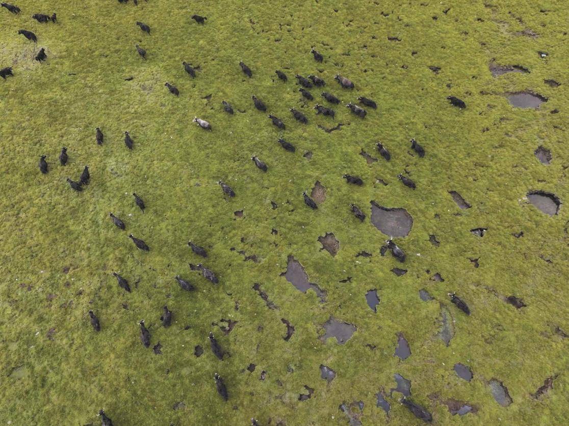 治多草甸上,牦牛群如移动的风景。马振东 肉旦尖措 摄